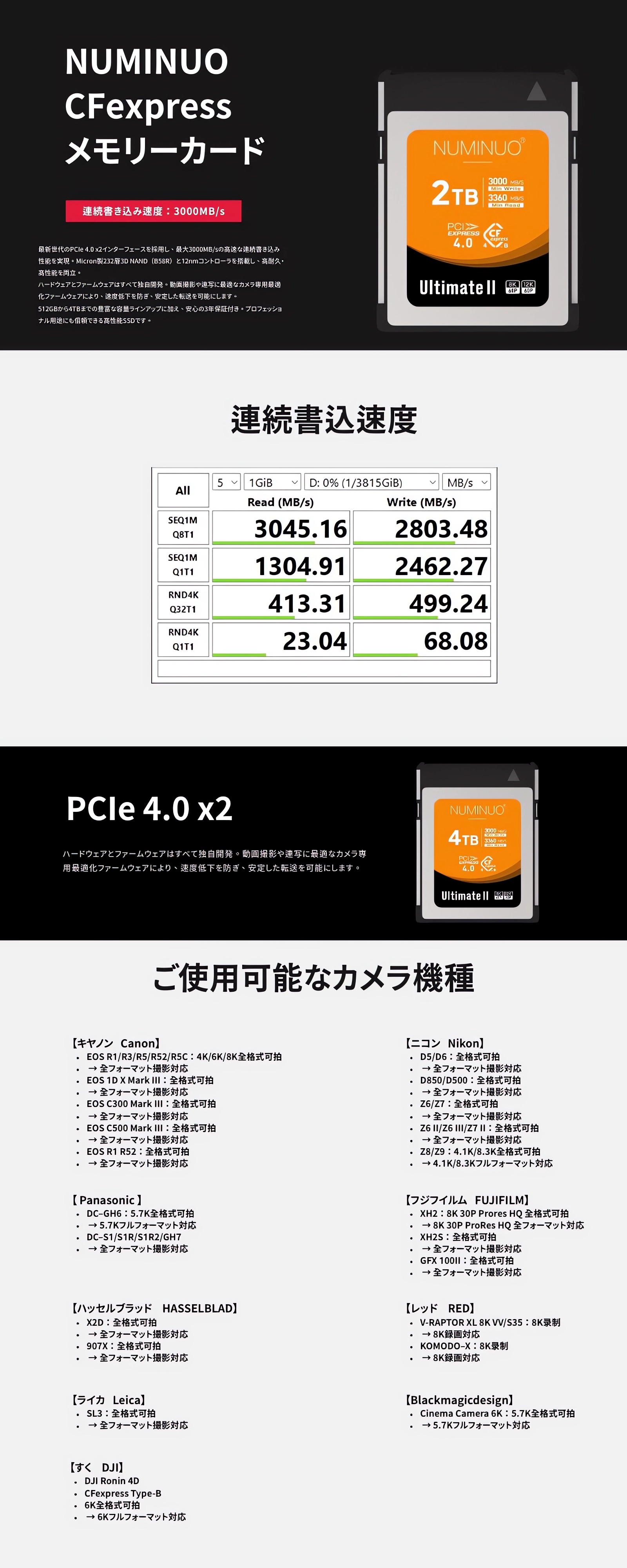 This professional CFexpress Type B card features a PCIe 4.0 x2 interface and NVMe Express protocol, achieving a maximum read speed of 3360MB/s and sustained write speed up to 3000MB/s.